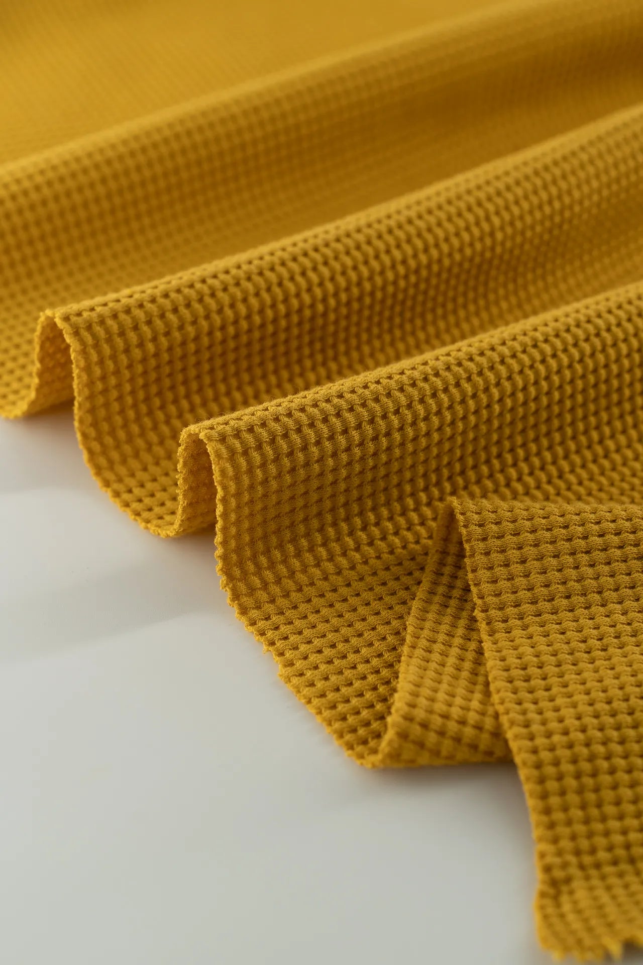 Tecido de malha waffle feito de algodão GOTS e ligeiramente elástico, que forma uma estrutura que o torna especialmente macio.